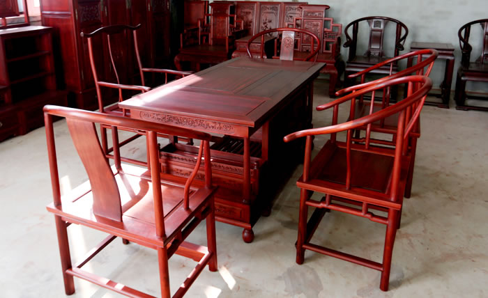 江蘇中尊木業有限公司書房系列產品:書房五件套草龍書柜、草龍大班枱、卷書寶座椅,洋花寫字枱等。