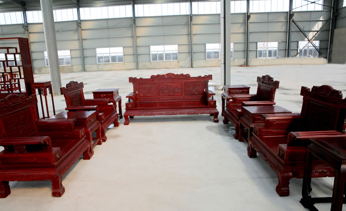 江蘇中尊木業有限公司客廳系列產品:博古架、皇冠圈椅三件套、皇冠圈椅三件套、如意茶桌六件套、如意供枱、沙發十件套、組合電視柜等。